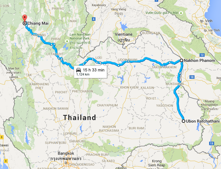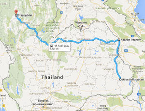 Und von Pakse in Südlaos habe ich dann zum zweiten Mal in diesem Jahr die Grenze nach Thailand überschritten und meine Route sah wie folgt aus: